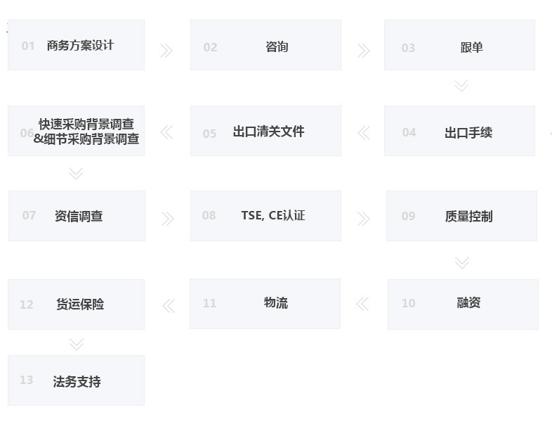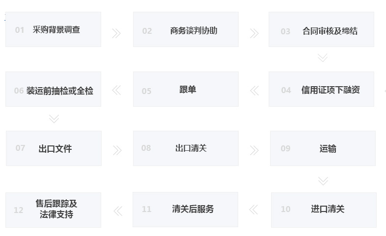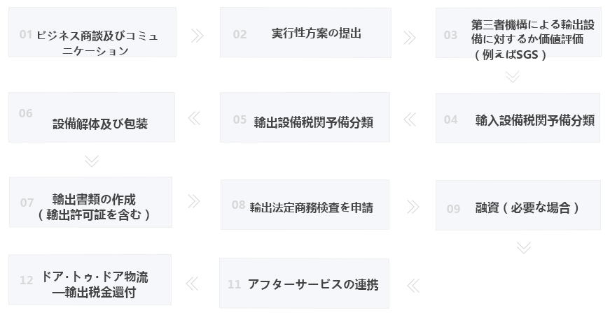 ワンストップ式サービスは:ビジネス商談援助、第三者機構による価格評価(CCIC/SGS)、國際決算、輸出稅金還付、國內外設備解體と包裝、商務検査屆出(予備検査を含む)、ドア?トゥ?ドア物流が含まれます。