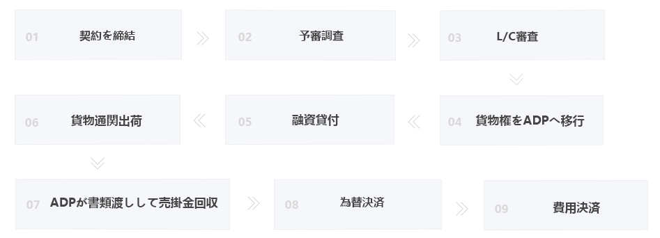 ADPが輸出通関と國際物流を取り扱い、且つADPが実際の貨物権をコントロールした後に融資サービスを行います。