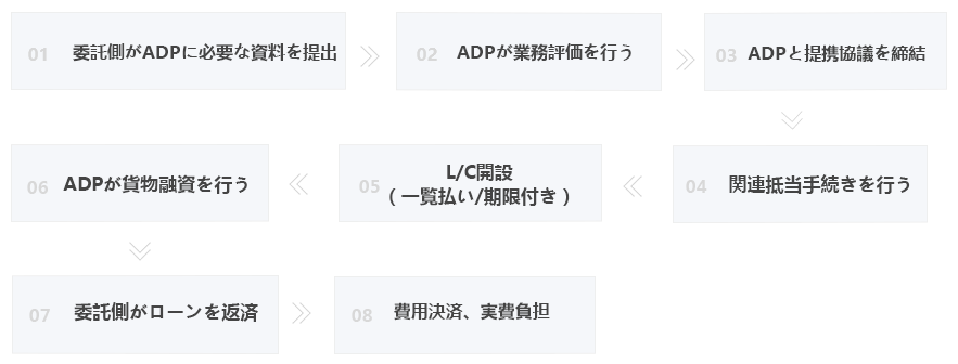 ADPはL/C取引項目におけるバイヤーに対して綜合貿易サービスを提供します。ADPの審査を受けたあとに、貨物権、不動産などをADPに抵當して輸入融資が獲得で、ADPにより貨物の輸入、物流などのその他の関連サービスを行います。