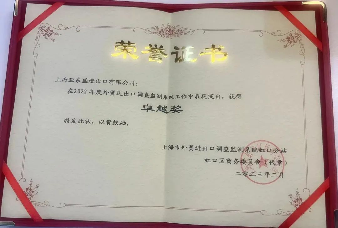2022年,虹口區51家樣本企業克服疫情影響,積極參與網上直報和問卷調查,月均上報率接近100%,居全市各分站前列,獲得市外貿進出口調查監測中心的充分認可。會上,虹口區商務委副主任羅文祥向上海亞東盛進出口有限公司等企業頒發了卓越獎與優秀獎。